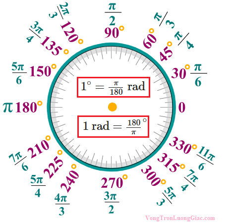 Từ radian sang độ: $x \text{ rad} = x \cdot \frac{180}{\pi}^\circ$